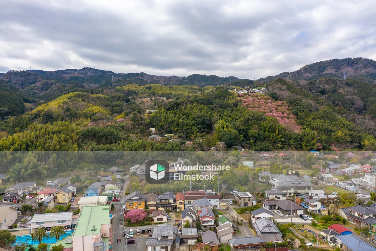 河津桜が咲いて山に緑とピンクが入り混じる景色