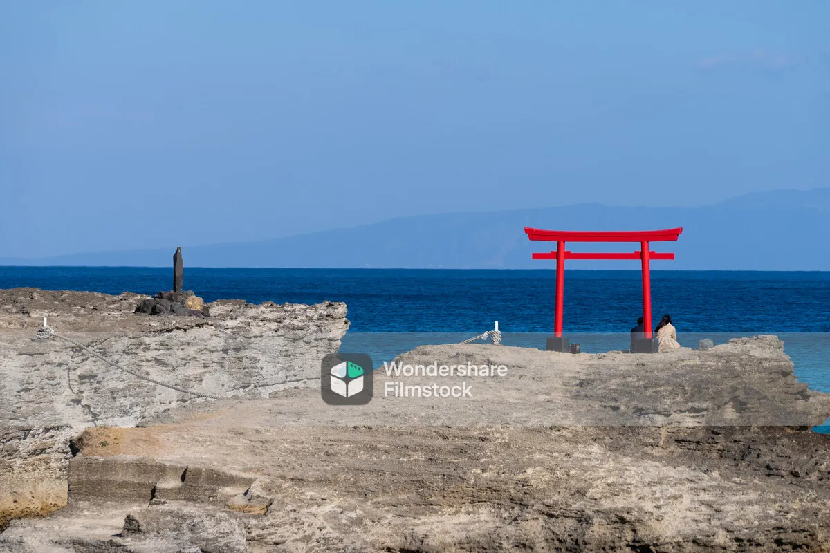 白浜海岸の岩場に建つ鳥居から海を眺めるカップル