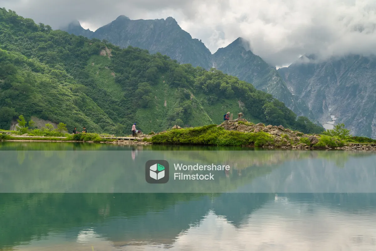 山と雲と人が湖に映る
